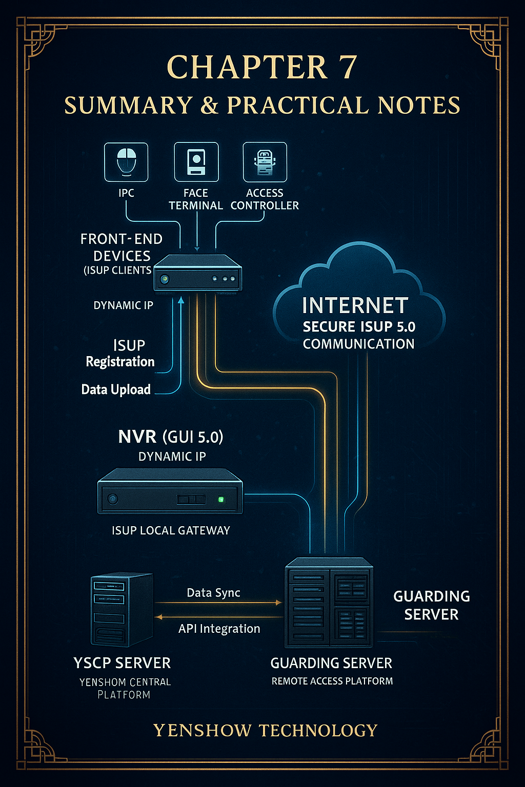 完整呈現 ISUP 生態架構:前端設備、NVR、Internet 與 YSCP/Guarding 平台的整合流程,象徵智慧安防系統的集中化與雲端化。