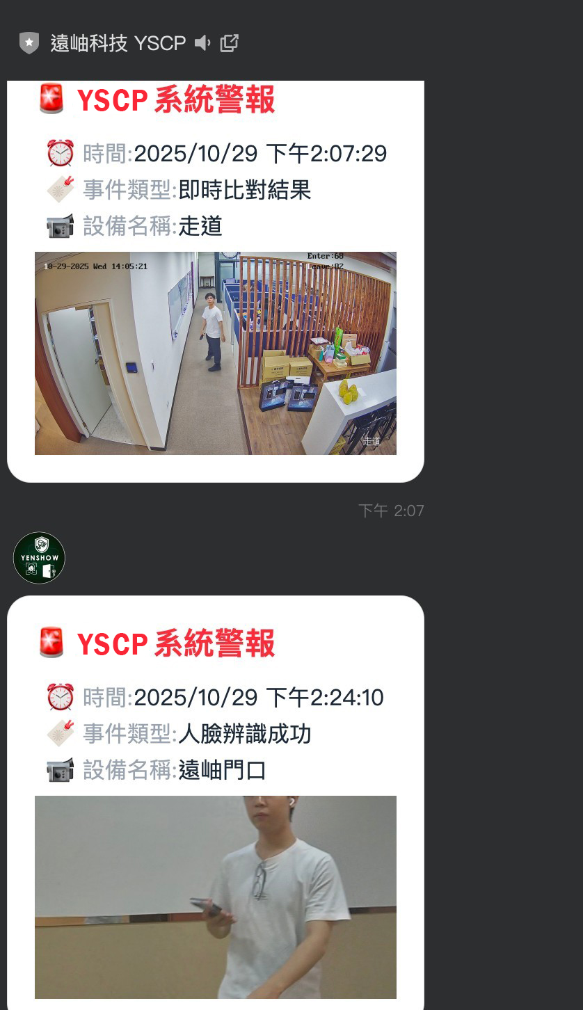 遠岫科技(YenShow Technology)正式推出 「YSCP × LINE BOT 即時警報整合方案」,讓使用者可直接透過 LINE 接收 YSCP 平台的即時警報與事件通知。此方案結合了人臉識別、門禁、車牌辨識與溫度警報等多項監控功能,實現「從中央監控到行動通知」的一步到位管理體驗。